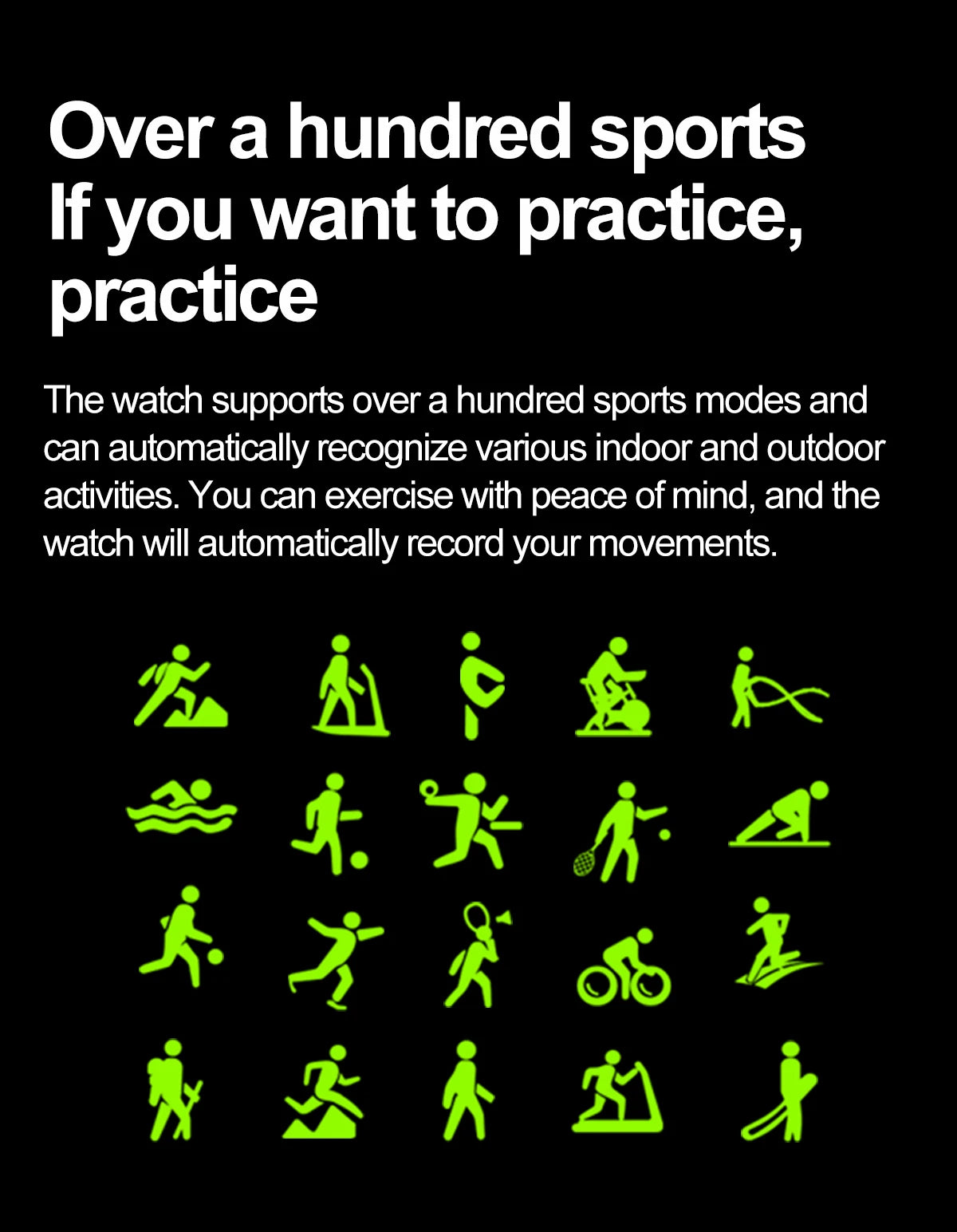 Stay on top of your health with advanced tracking features, including heart rate, blood oxygen, sleep patterns, blood pressure, body temperature, and stress monitoring. Whether you're working out or managing your daily routine, this watch keeps you informed through its comprehensive fitness tracking system.