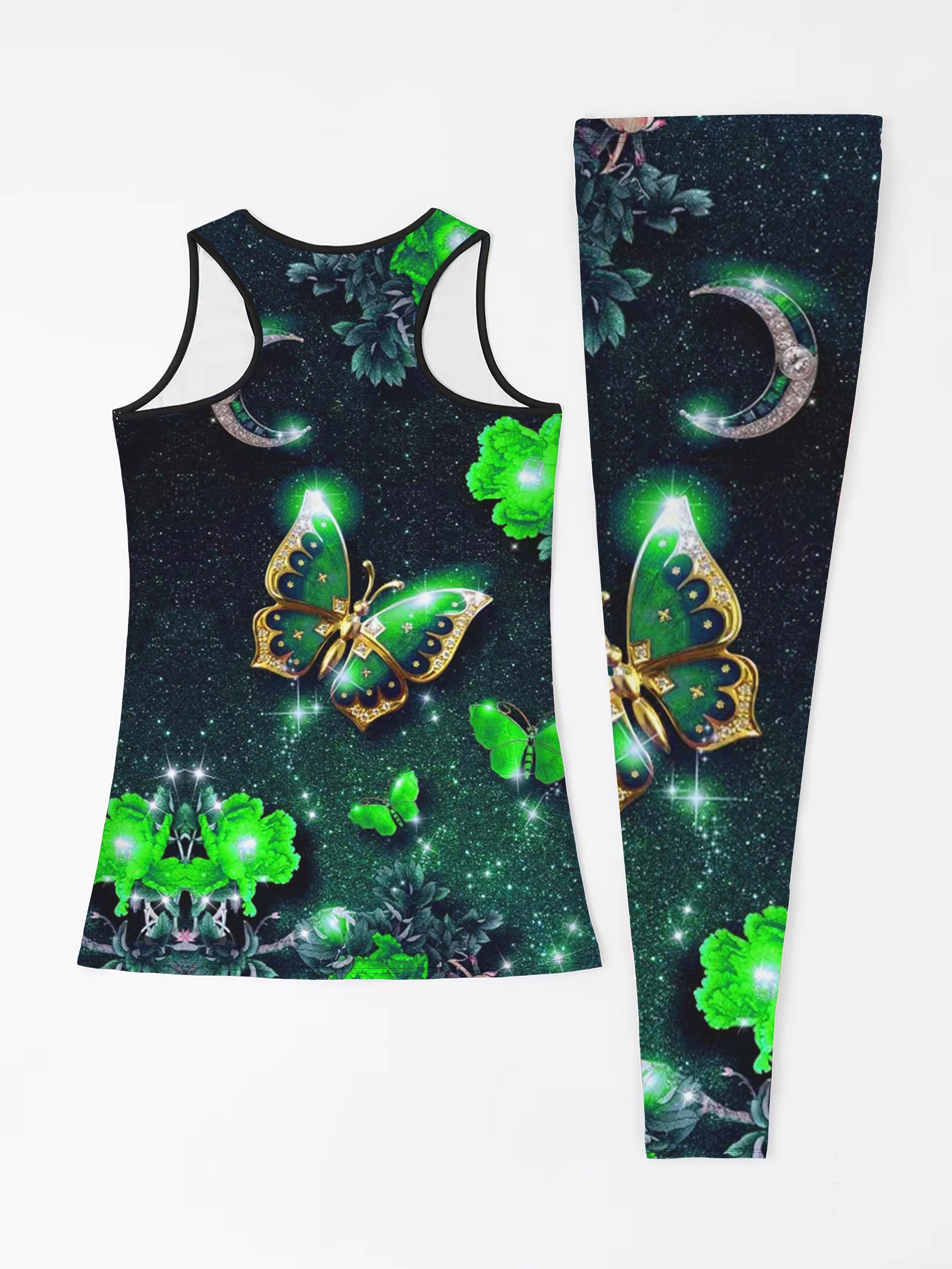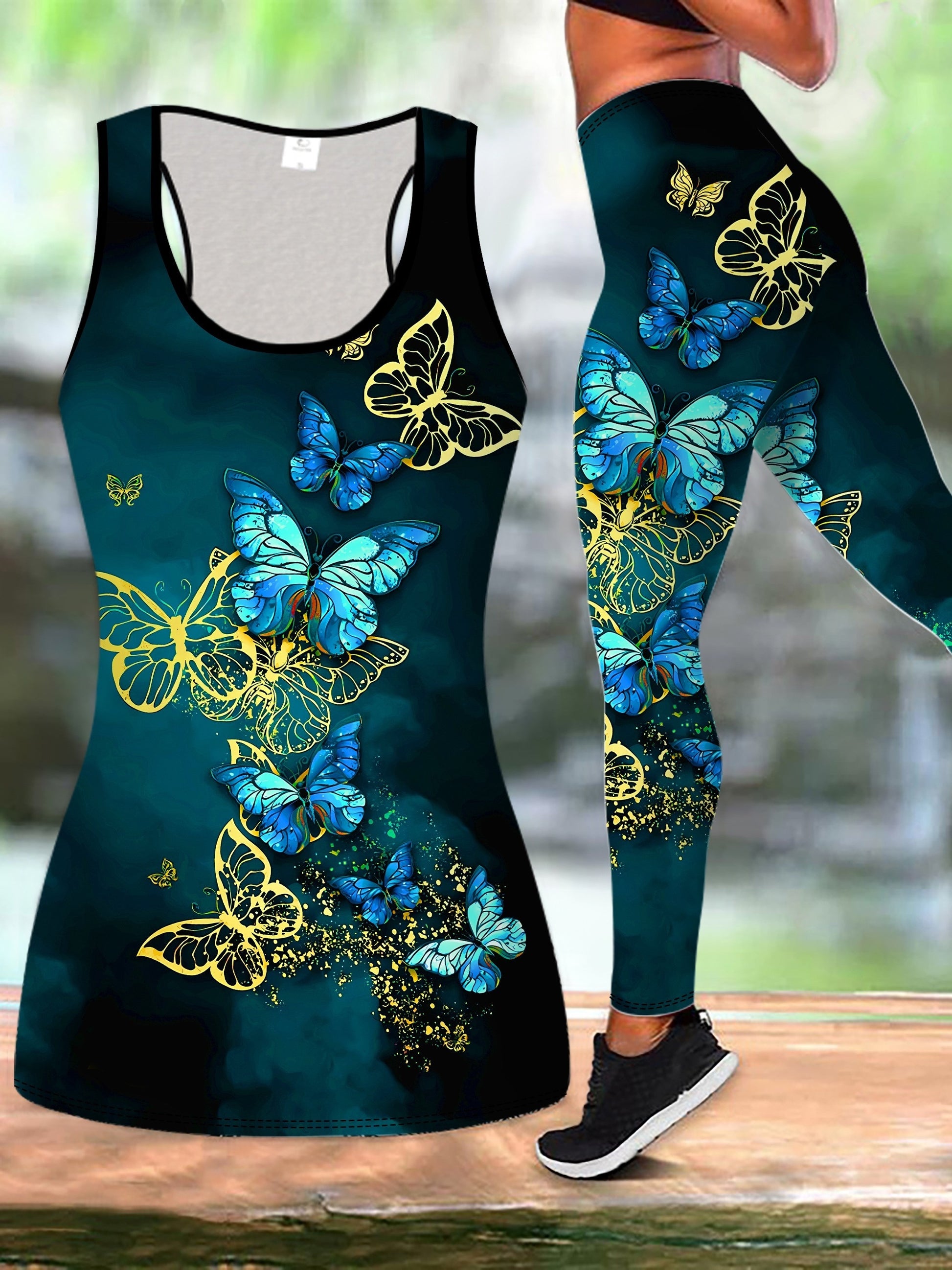 Add a touch of shine to your fitness routine with the Rhodi10 Two-Piece Casual Fitness Set, featuring a whimsical all-over butterfly print that radiates energy and femininity. This stylish set includes a loose-fit tank top and coordinating leggings, crafted from a soft, micro-elastic knit blend of 95% polyester and 5% spandex for lightweight comfort and gentle stretch. Designed for all-season wear, it combines fashion-forward flair with functional ease, making it perfect for casual workouts or laid-back days. With its machine-washable care and eye-catching shimmer, the Rhodi10 set brings playful charm to your activewear collection.