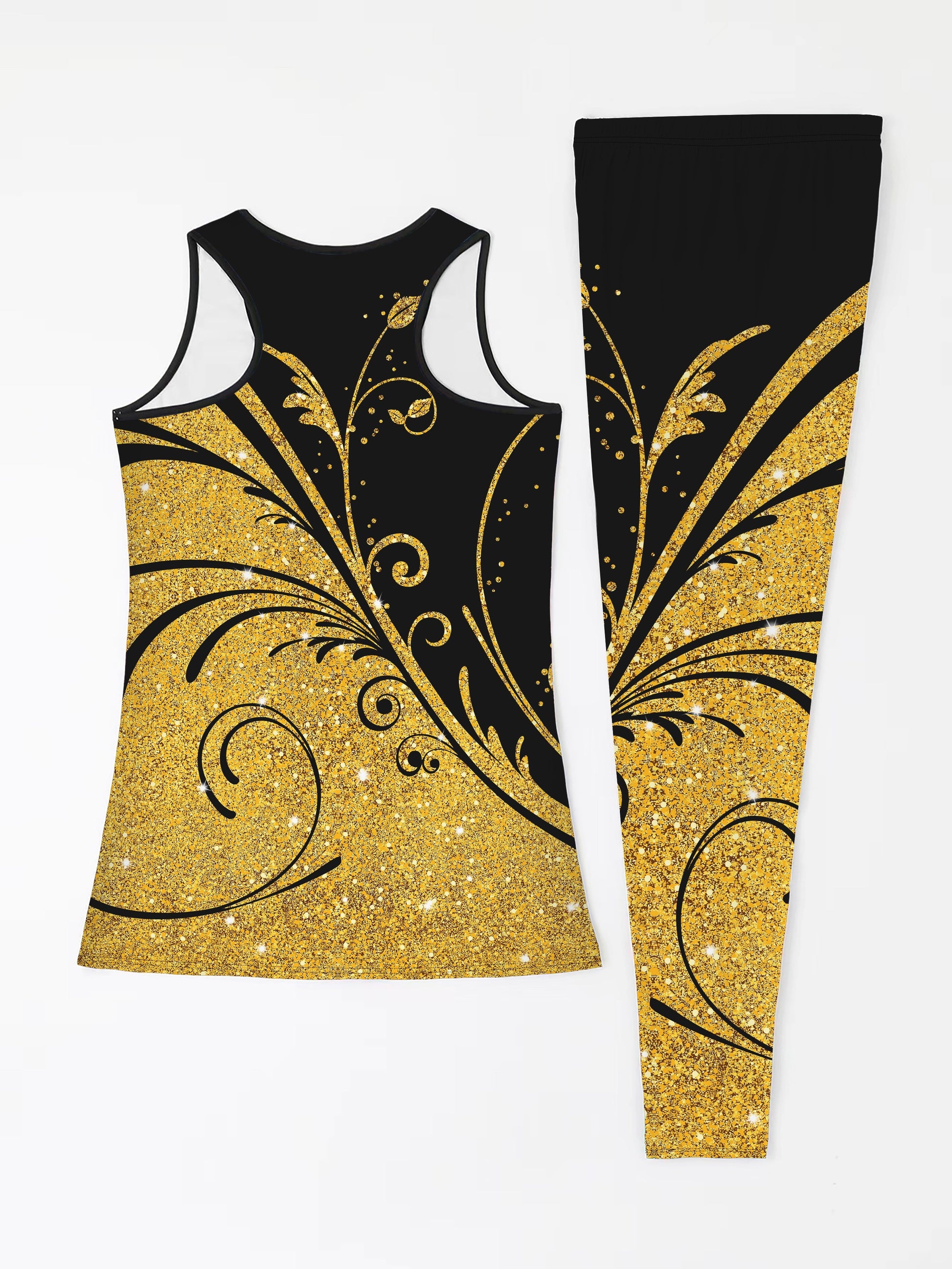 Step into elegance with the Rhodi7 Floral Print Fitness Set — where fitness meets femininity in effortless harmony. This two-piece set features a sleek black and golden floral print tank top paired with matching leggings, offering a striking yet sophisticated look. Made from a breathable, micro-elastic polyester-spandex blend, it ensures comfort and ease of movement whether you're stretching, training, or strolling through your day. The loose-fit design and crew neck collar enhance wearability, while the bold floral pattern adds a touch of luxury. Easy to care for and perfect for all seasons, the Rhodi7 set redefines casual activewear with style and grace.