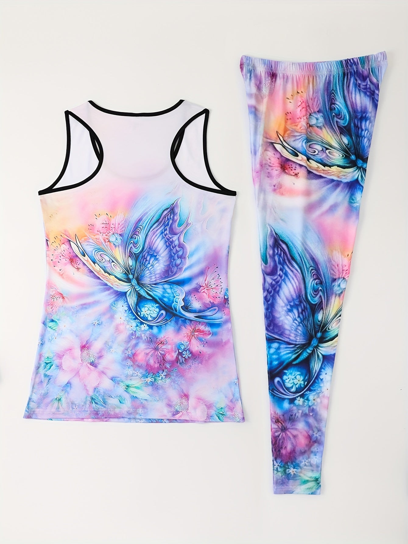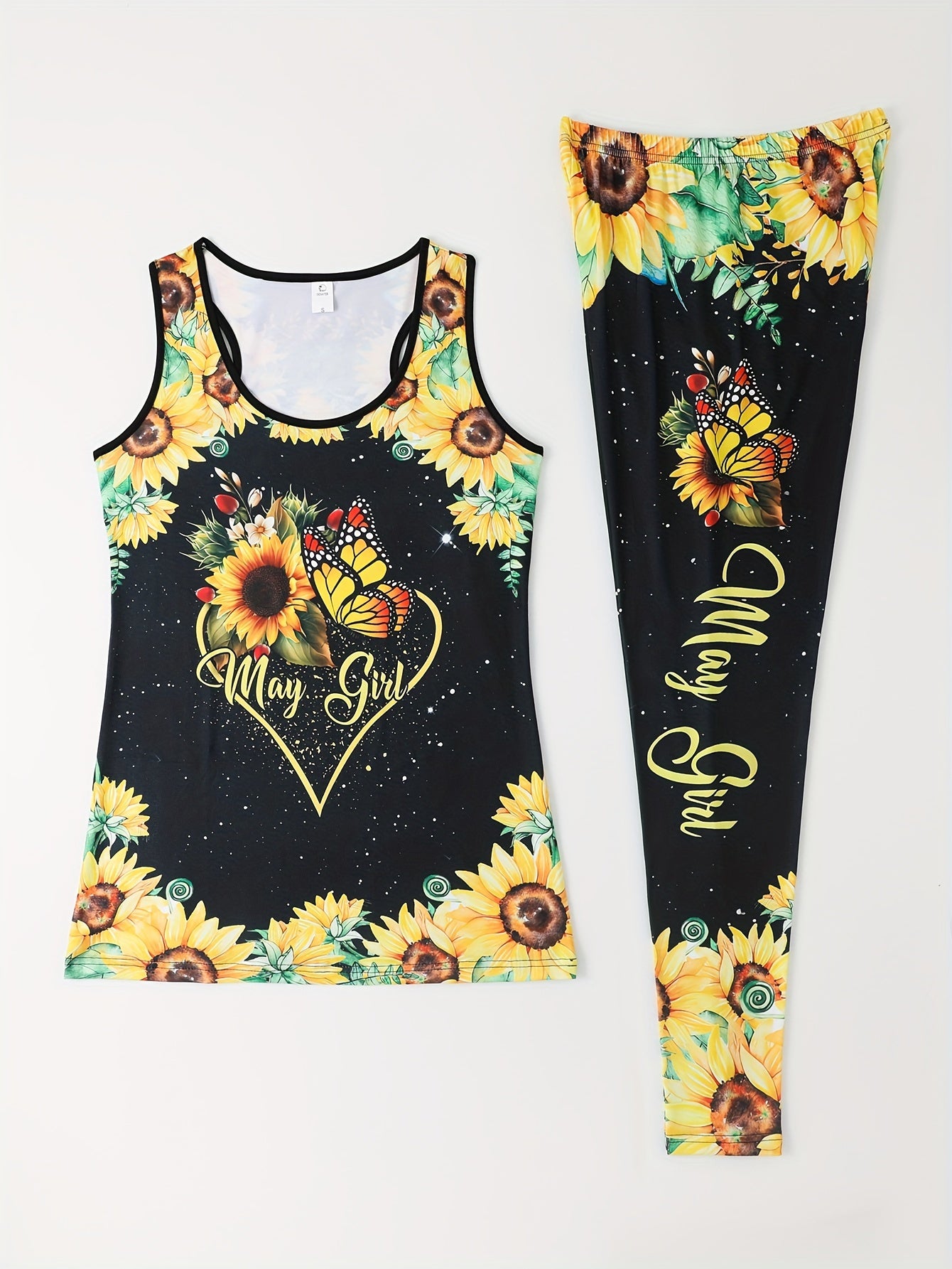 Brighten your workout wardrobe with the Rhodi8 Two-Piece Sports Outfit, featuring a vibrant sunflower and butterfly all-over print. This eye-catching set includes a crew neck racerback tank top and matching skinny pants, designed to combine comfort, color, and casual flair. Made from a lightweight knit fabric with micro elasticity (95% polyester, 5% spandex), it offers just the right amount of stretch for all-day ease. Perfect for any season, this non-sheer, machine-washable set is both stylish and practical, ideal for active days or laid-back lounging. Celebrate your individuality with a look that’s as bold and beautiful as you are.