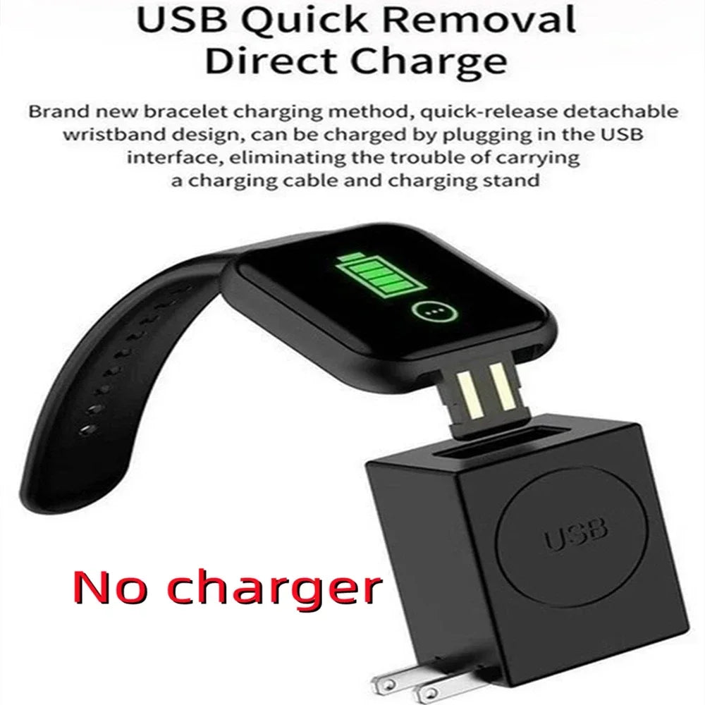 Stay connected, fit, and in control with the all-in-one Smart Wristwatch — designed for both men and women who lead active, tech-savvy lives. With a sporty square design and comfortable silicone band, this watch blends style with smart functionality. Enjoy Bluetooth connectivity for music playback, call alerts, and app syncing, while tracking your steps, sleep, calories, and heart rate in real time. It features a week display, alarm, sedentary reminder, and a unique USB direct-charging method for ultimate convenience. Whether you're hitting the gym or managing your day, this digital smartwatch is your ideal companion for smarter living on the go.